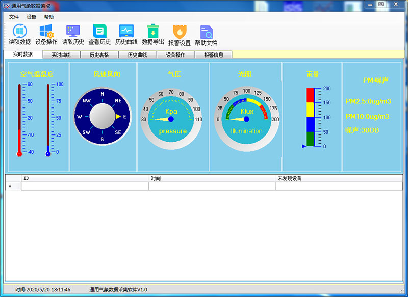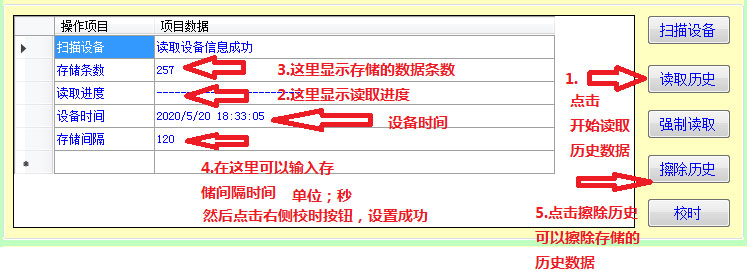 點(diǎn)擊右側(cè)的刷新,在串口號后面選擇剛才查看到的COM口號,點(diǎn)擊查找,此時(shí)軟件會識別到設(shè)備信息,并在左側(cè)顯示出來。①讀取數(shù)據(jù),可以觀察到傳感器的實(shí)時(shí)數(shù)據(jù)。②讀取歷史數(shù)據(jù):點(diǎn)擊讀取歷史可讀取歷史數(shù)據(jù)